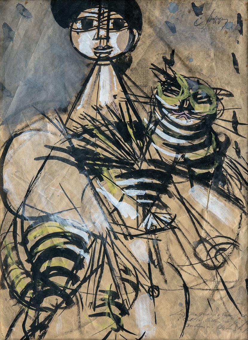 Lojze Spazzapan, Dama z mačko, 1951, gvaš, tuš, papir, zasebna zbirka, foto: Primož Brecelj