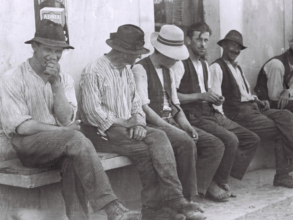 Veno Pilon, Moški tipi: Tomajci (Kras) pri opoldanskem odmoru, 1922–1925, č/b negativ, 6,5 x 9 cm