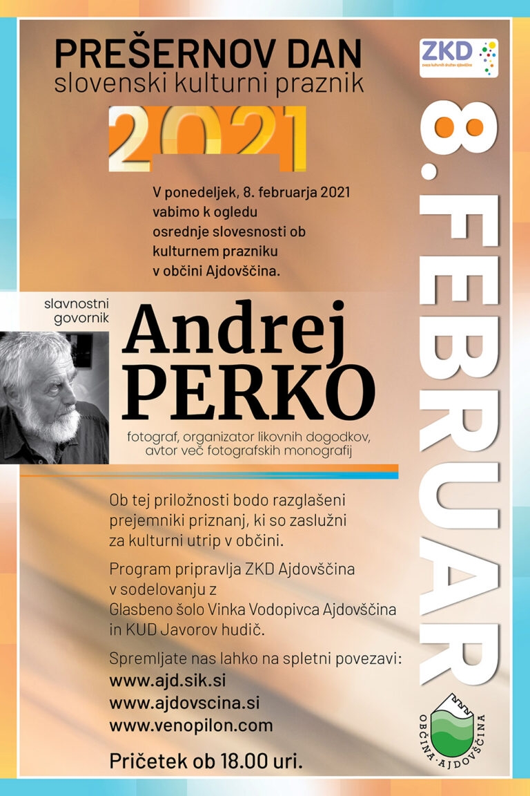Zveza kulturnih društev Ajdovščina vabi k spremljanju osrednje proslave v občini ob kulturnem prazniku. Slavnostni govornik na proslavi bo priznani fotograf Andrej Perko iz Vipavskega Križa. V okviru proslave bodo razglašeni letošnji prejemniki priznanj ZKD Ajdovščina. Proslavo si lahko ogledate na spletni strani Lavričeve knjižnice in Občine Ajdovščina, v ponedeljek, 8. februarja, ob 18. uri.